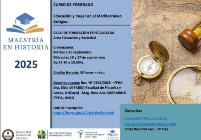 En el marco de la Maestría en Historia de la Facultad de Filosofía, Humanidades y Artes de la Universidad Nacional de San Juan, se dictará el Curso de Posgrado: Educación y mujer en el Mediterráneo Antiguo.