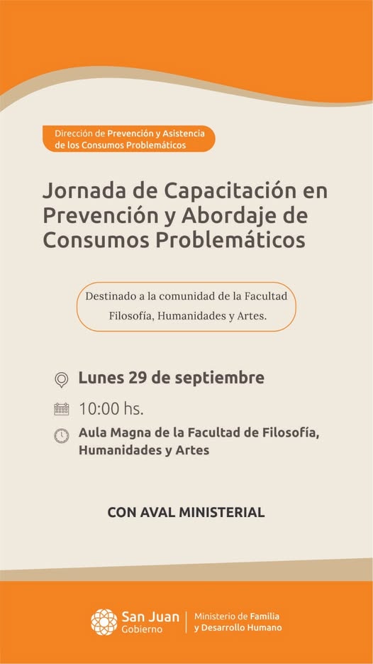 La Facultad de Filosofía, Humanidades y Artes (FFHA) de la Universidad Nacional de San Juan (UNSJ) y la Dirección de Prevención y Asistencia de los Consumos Problemáticos invitan a la Jornada de Capacitación en Prevención y Abordaje de Consumos Problemáticos. La actividad se realizará el lunes 29 de septiembre a las 10 en el Aula Magna de FFHA.
