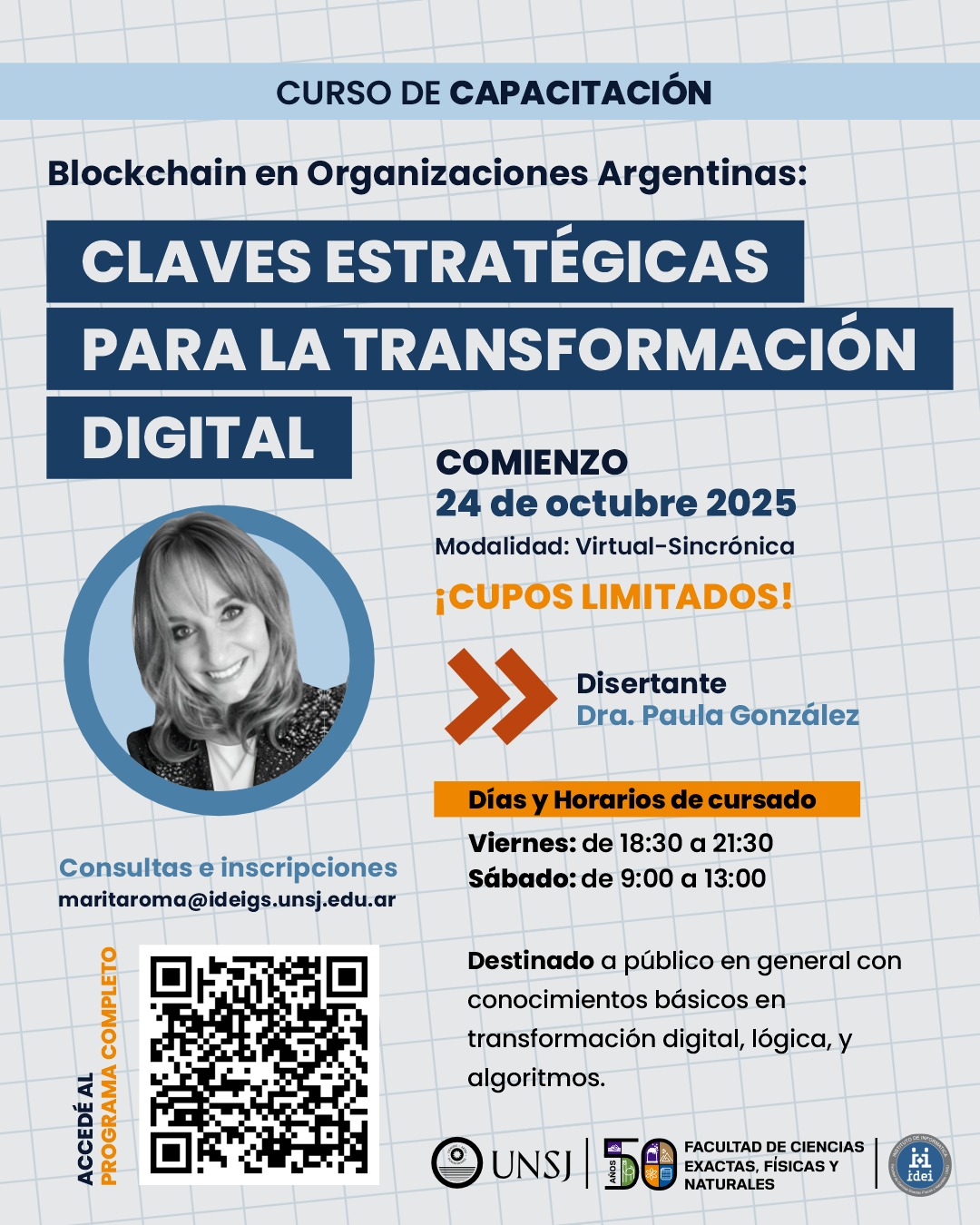 La Facultad de Ciencias Exactas, Físicas y Naturales de la Universidad Nacional de San Juan invita al Curso sobre Blockchain en Organizaciones Argentinas “Claves Estratégicas para la Transformación Digital” que comienza el 24 de octubre.