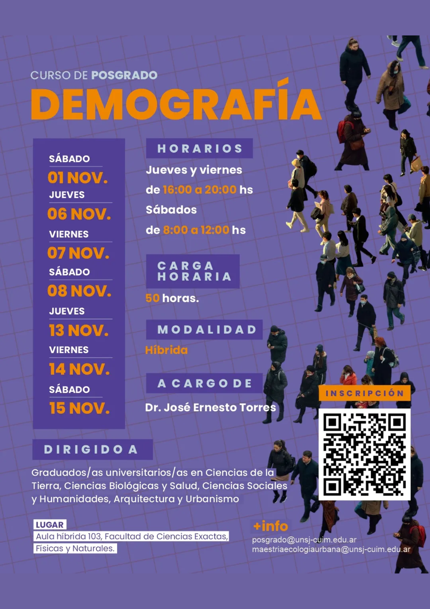 La Facultad de Ciencias Exactas, Físicas y Naturales de la Universidad Nacional de San Juan informa que se encuentran abiertas las inscripciones para el Curso de Posgrado en Demografía, a cargo del Dr. José Ernesto Torres.
