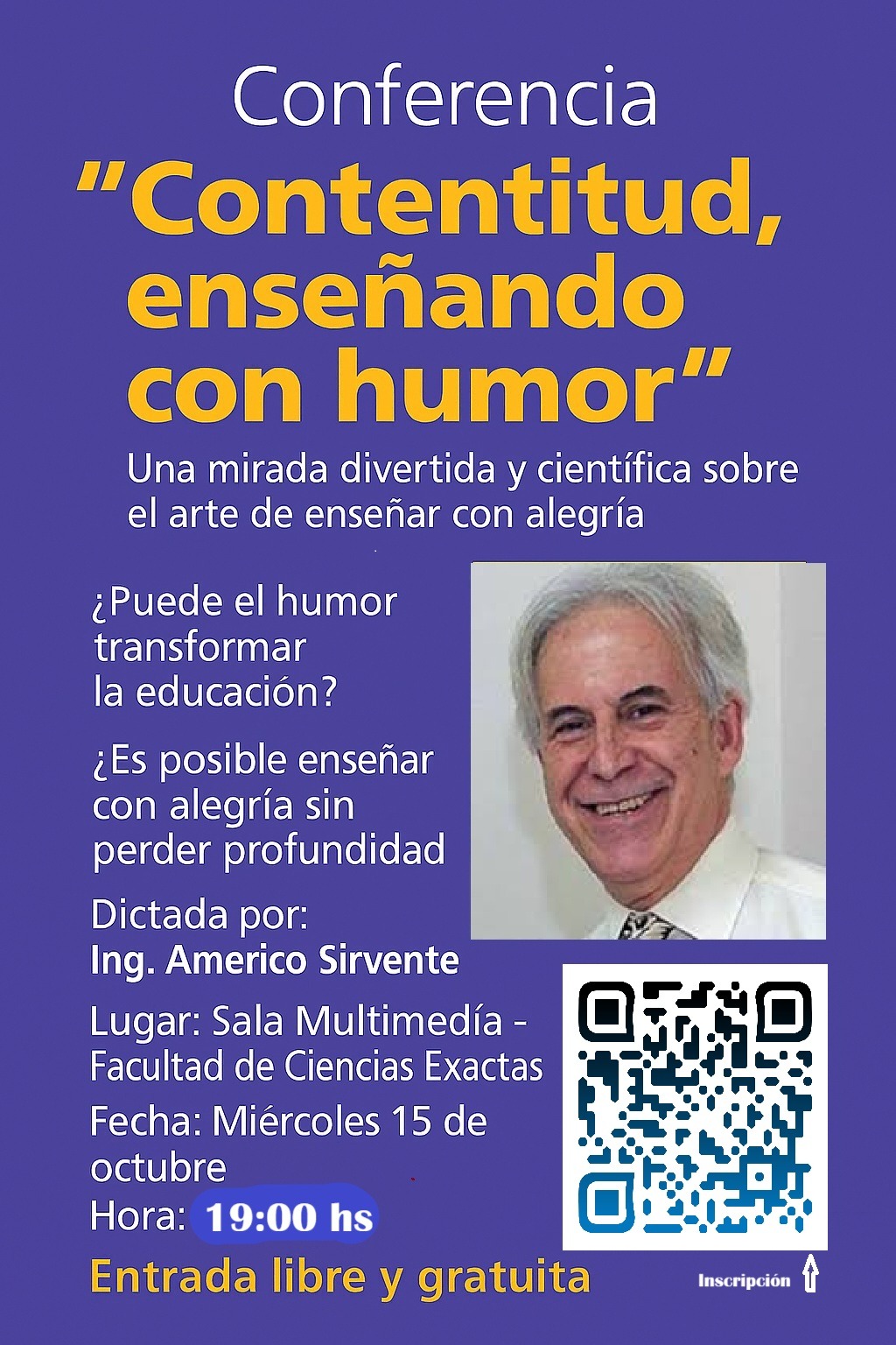 Desde la Facultad de Ciencias Exactas, Físicas y Naturales (FCEFN) se dictará una Conferencia: sobre "Contentitud, enseñando con humor". Una mirada divertida y científica sobre el arte de enseñar con alegría. La conferencia planteará si puede el humor transformar la educación, y si es posible enseñar con alegría sin perder la profundidad.