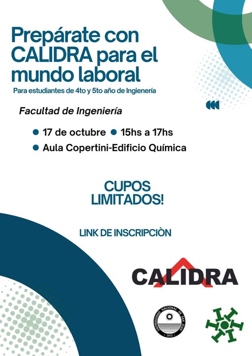 La Facultad de Ingeniería invita a futuros egresados/as a una Charla Informativa denominada “Prepárate con CALIDRA para el mundo laboral” a realizarse el 17 de octubre en el Aula Copertini del Edificio Química desde las 15 a 17.