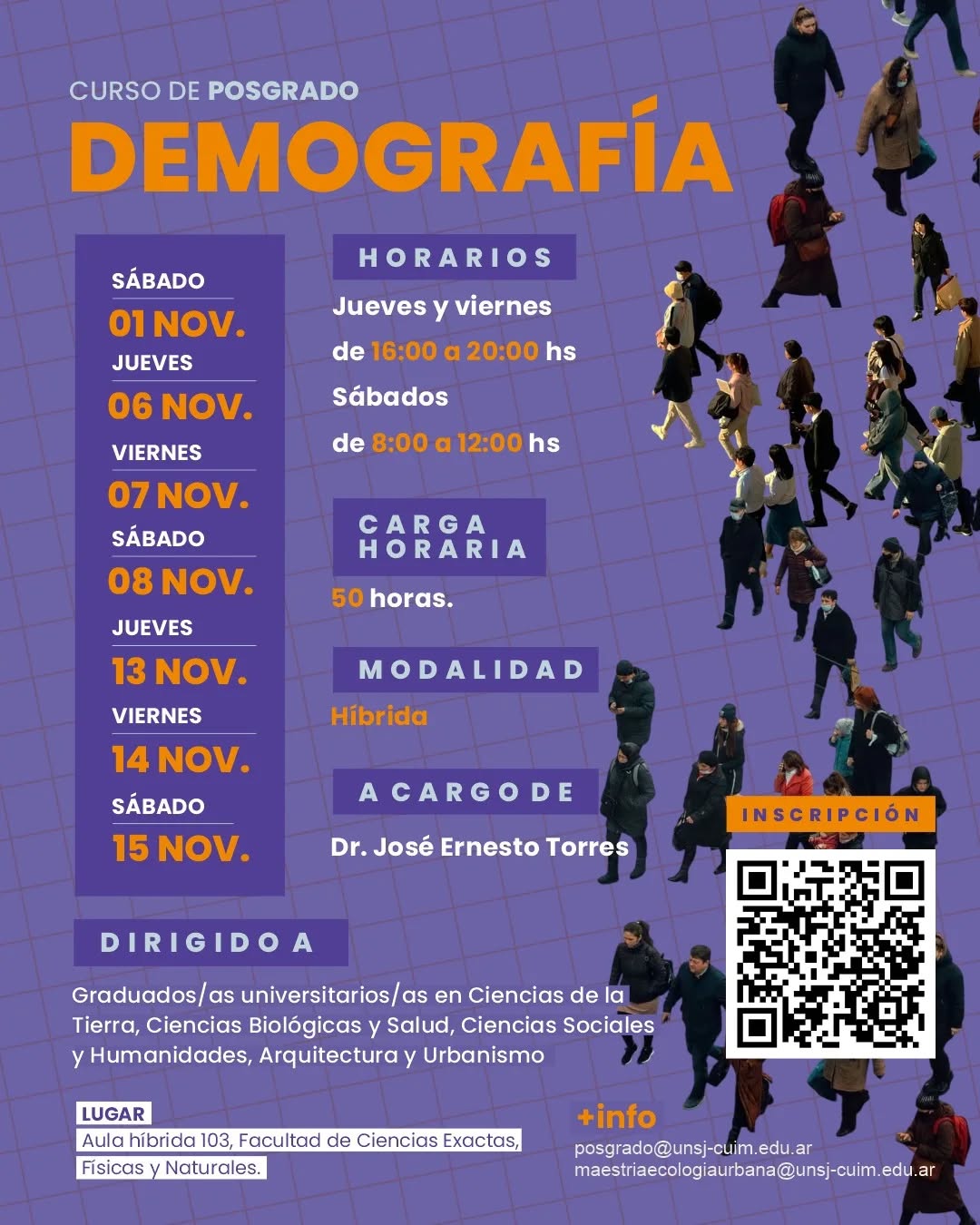 En el marco de la Maestría en Ecología Urbana se dictará un Curso de Posgrado en Demografía. La formación iniciará el 1 de noviembre y finalizará el 15 del mismo mes. Los horarios de cursado son jueves y viernes de 16 a 20 y sábados de 8 a 12.