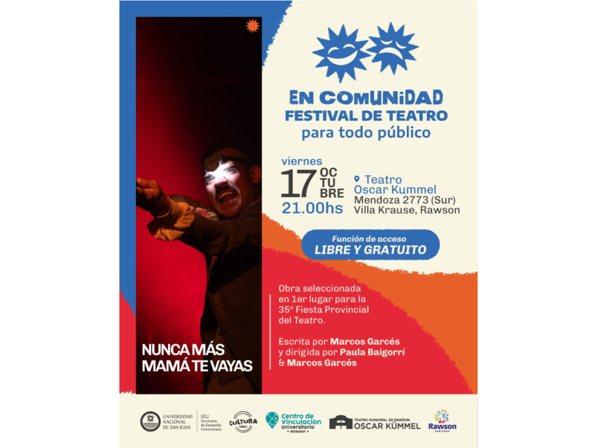 En el marco del Programa “En comunidad. Arte y cultura para todo público” de la Dirección de Cultura de la Secretaría de Extensión de la UNSJ, se realizará otra función del Festival de Teatro para todo público, este viernes 17 a las 21 en el Teatro Oscar Kummel ubicado en calle Mendoza 2773 (Sur), Villa Krause, Rawson, con entrada libre y gratuita.