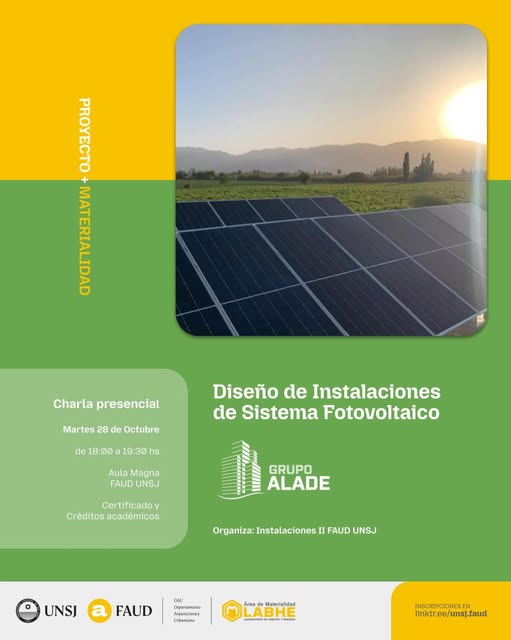 El Laboratorio de Hábitat y Energía (LABHYE) y el Departamento de Arquitectura y Urbanismo (DAyU) de la Facultad de Arquitectura, Urbanismo y Diseño (FAUD), realizarán una charla sobre Diseño de Instalaciones de Sistema Fotovoltaico, en el marco de la asignatura Instalaciones II.