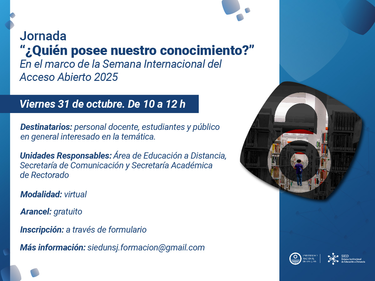 La Universidad Nacional de San Juan, a través Área de Educación a Distancia (AED - SIED UNSJ), en consonancia con los principios y lineamientos de la Semana Internacional del Acceso Abierto 2025, organiza la jornada virtual “¿Quién posee nuestro conocimiento?”.
