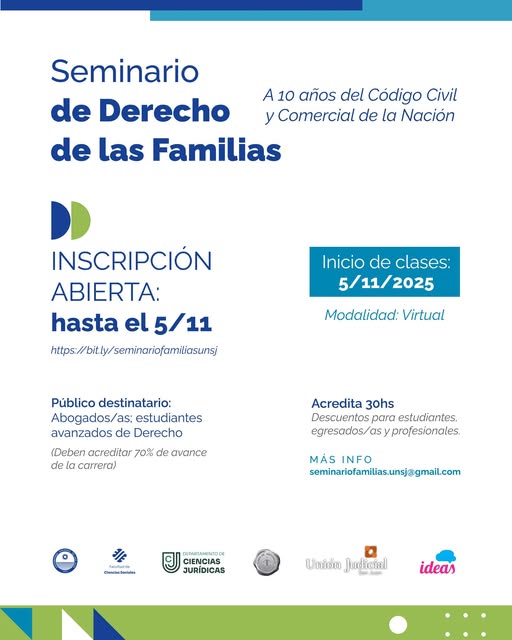 El seminario abordará los cambios y debates actuales en torno a la socioafectividad, las familias digitales, la niñez, los géneros y discapacidad. Se propone como un espacio de reflexión y debate académico que permita analizar los avances, desafíos y nuevas perspectivas en la materia. La reciente jurisprudencia en temas vinculados al Derecho de las Familias, la niñez y los géneros evidencia la necesidad de una actualización constante por parte de los operadores jurídicos. Por ello, la participación de especialistas en la disciplina facilitará la identificación de problemáticas emergentes y estrategias para una aplicación efectiva de los principios consagrados en estas normativas, considerando el actual contexto social y tecnológico.