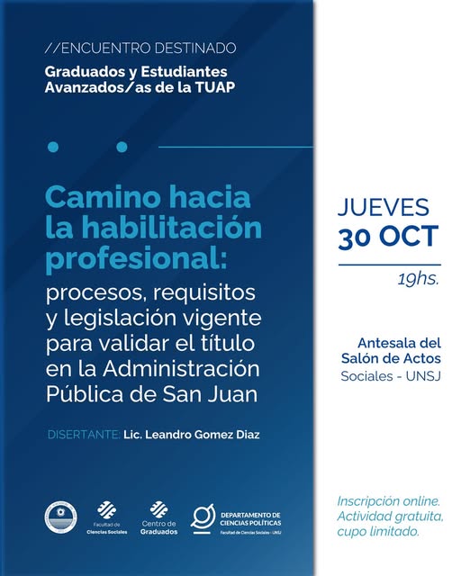 El jueves 30 de octubre a las 19 en la Antesala del Salón de Actos de la Facultad de Ciencias Sociales se realizará la charla “Camino hacia la habilitación profesional: procesos, requisitos y legislación vigente para validar el título en la Administración Pública de San Juan”.