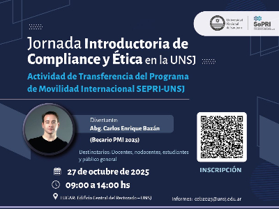 La "Jornada Introductoria de Compliance y Ética" es organizada por la Secretaría de Posgrado y Relaciones Internacionales (SePRI) de la UNSJ y se realiza en el marco del Plan de Transferencia del Programa de Movilidad Internacional (PMI) de esta Secretaría. La inscripción está abierta a través de código QR.