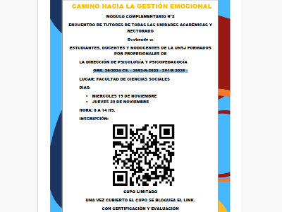 La Dirección de Psicología y Psicopedagogía de la Secretaría Académica de la UNSJ inicia las inscripciones del Taller “Camino hacia la Gestión emocional”, que se realizará en noviembre de 2025. Se trata de un encuentro de Tutores/as de todas las Unidades Académicas y Rectorado de esta Universidad. Está destinado a estudiantes, preceptores/as, docentes y nodocentes de la UNSJ.