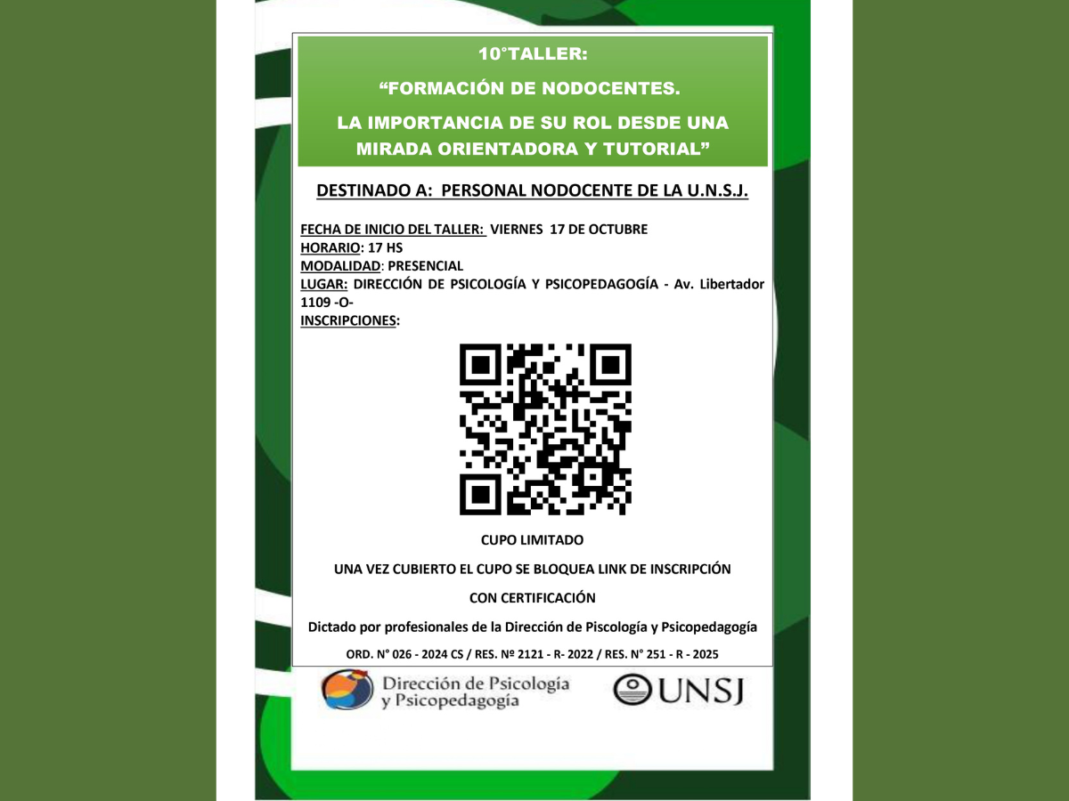 La Dirección de Psicología y Psicopedagogía dependiente de Secretaría Académica de la Universidad Nacional de San Juan, inicia la inscripción para el taller: “Formación de nodocentes. La importancia de su rol desde una mirada orientadora y tutorial”.