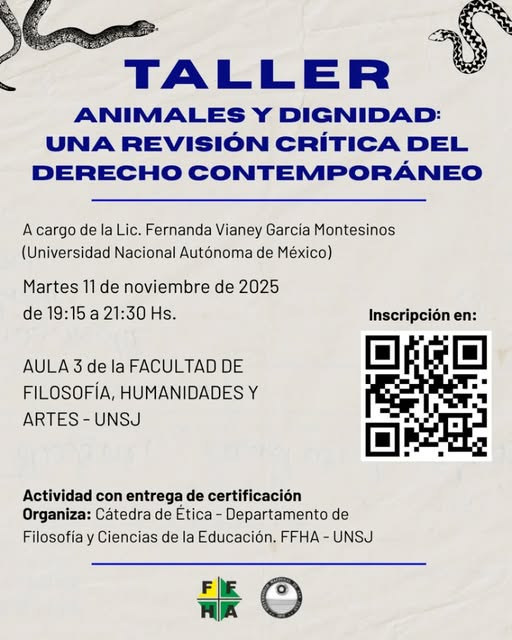 La Cátedra de Ética del Departamento de Filosofía y Ciencias de la Educación de la Facultad de Filosofía, Humanidades y Artes (FFHA) de la Universidad Nacional de San Juan realizará un Taller denominado “Animales y dignidad: una revisión crítica del derecho contemporáneo”. El encuentro es presencial y se realizará el martes 11 de noviembre de 2025, de 19:15 a 21:30 en el Aula 3 de FFHA.